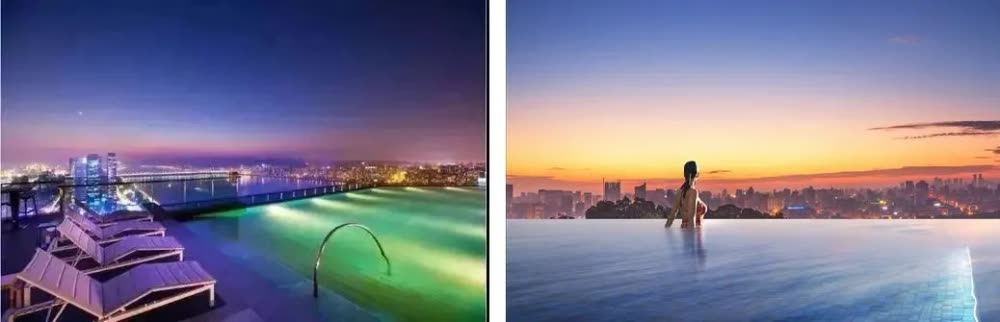 婀娜身姿轻跃而起,城市倒影在无边际泳池宽阔的水面...