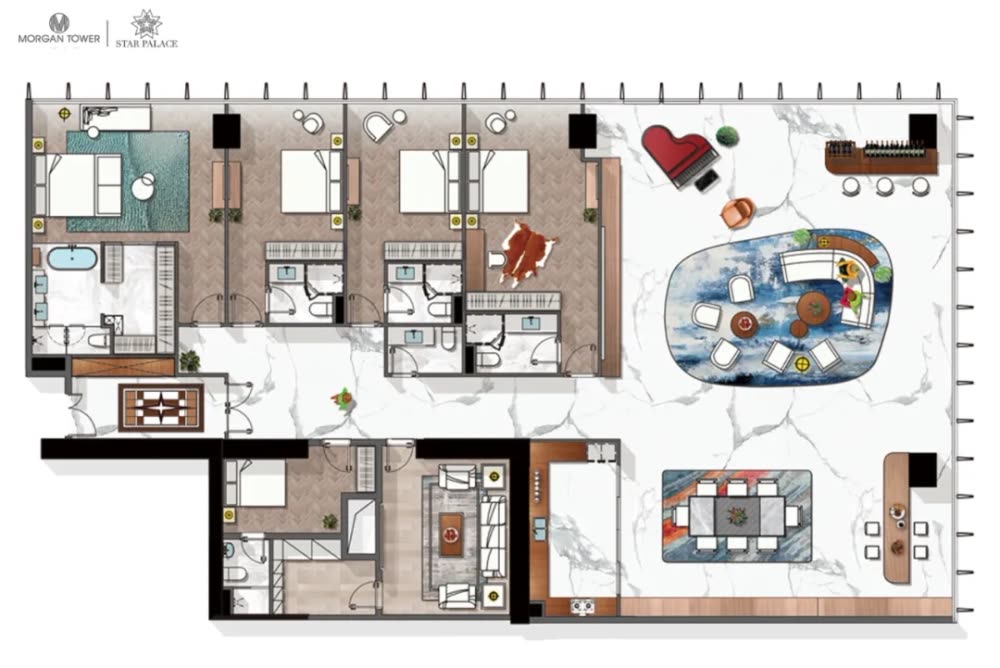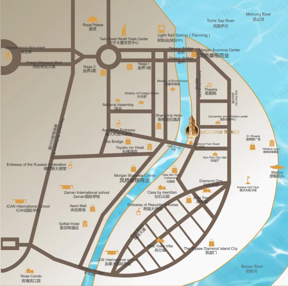 摩根大厦·星耀官邸Star palace选址在了湄公河三江汇聚的金边龙脉、有着“柬埔寨经济心脏、黄金CBD”的钻石岛核心,摩根大厦的40-45层。