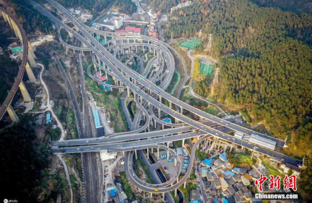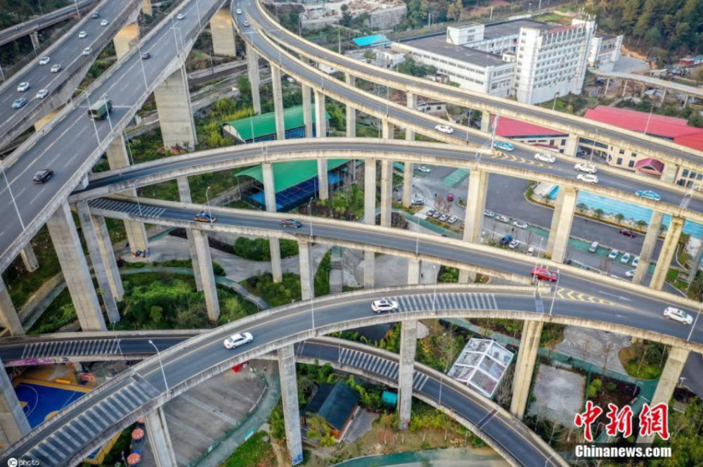 坐落于贵州省贵阳市的黔春路立交桥,因其“8D魔幻环绕”的特点,被称为中国“最复杂立交桥”。黔春路立交桥为5层立体交叉,包括8个出入口和11条匝道。空中俯瞰,密集的车道纵横交错,三回九转如同过山车一般绕晕“老司机”,令人目眩神摇。黔春路立交桥地处峡谷,空间狭小,最大垂直落差达55米,是当地重要的立体交通网。(来源:中国新闻网,图:ICphoto)