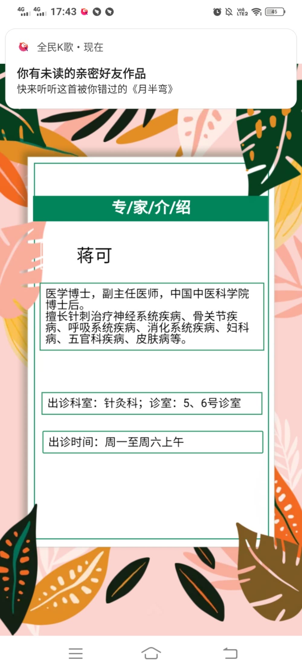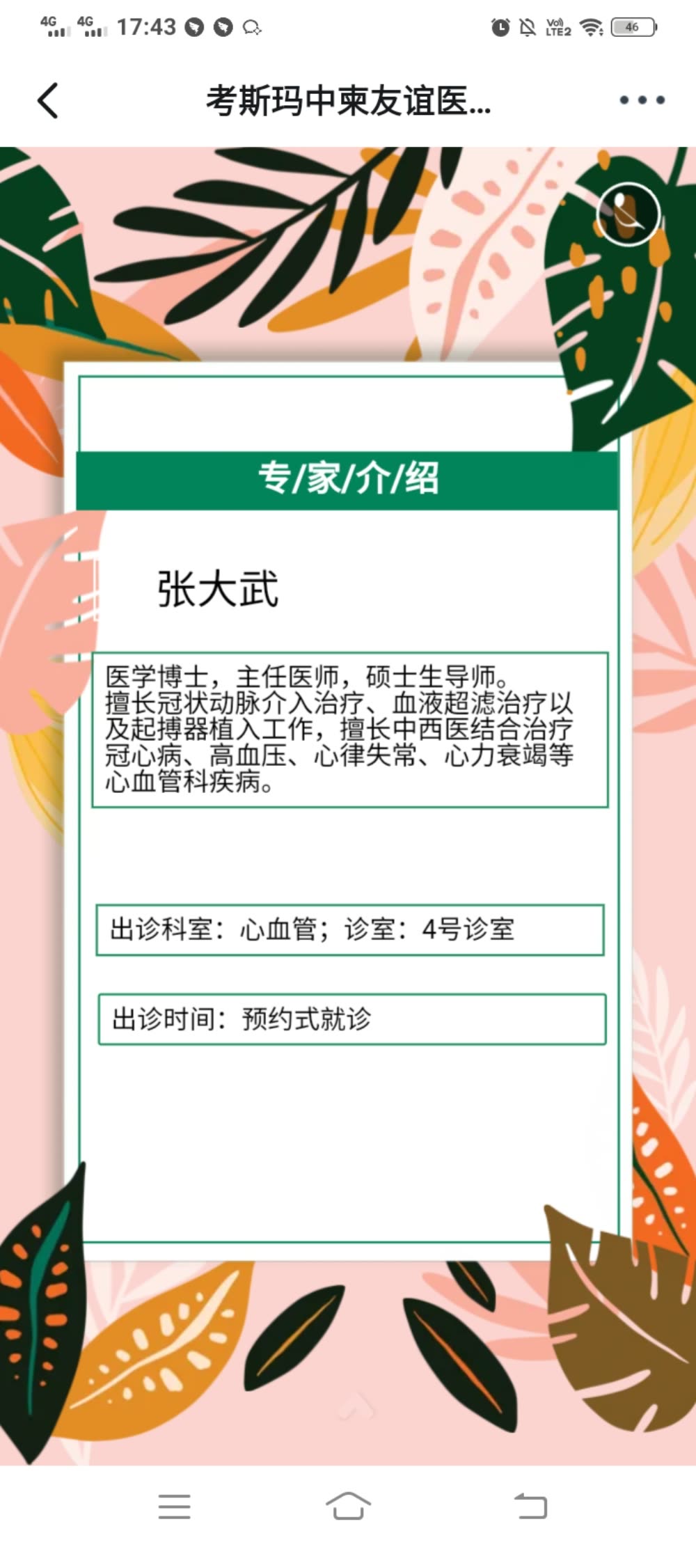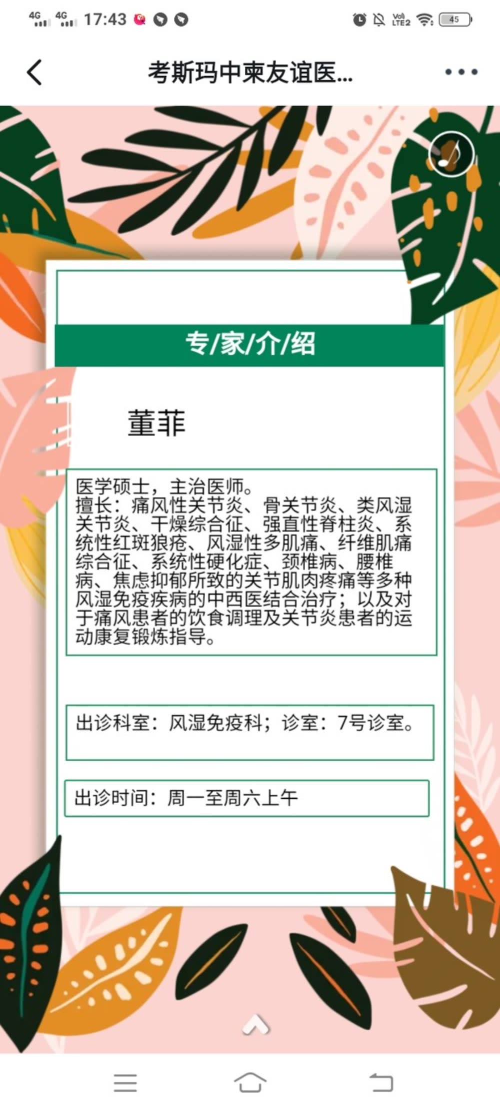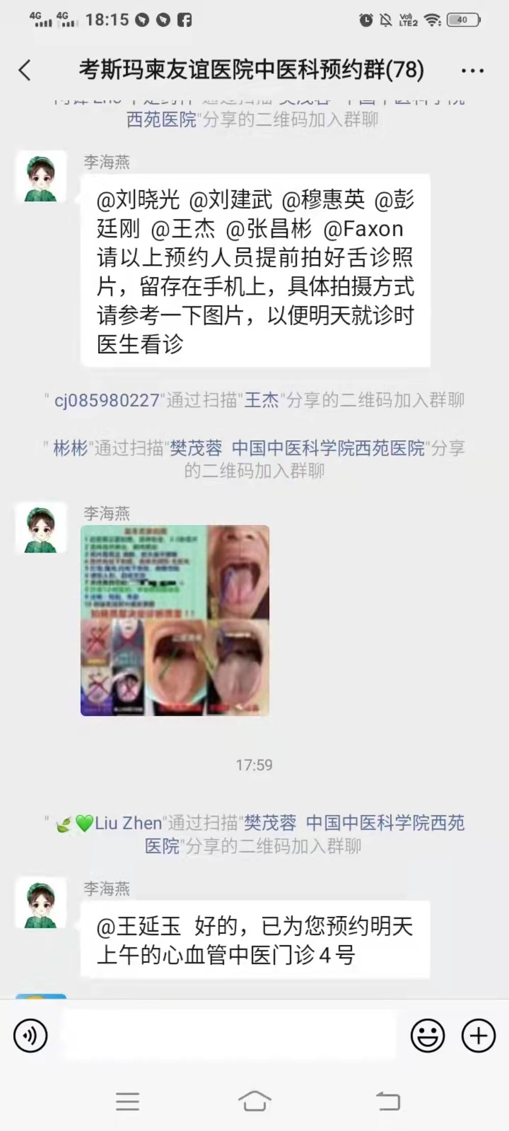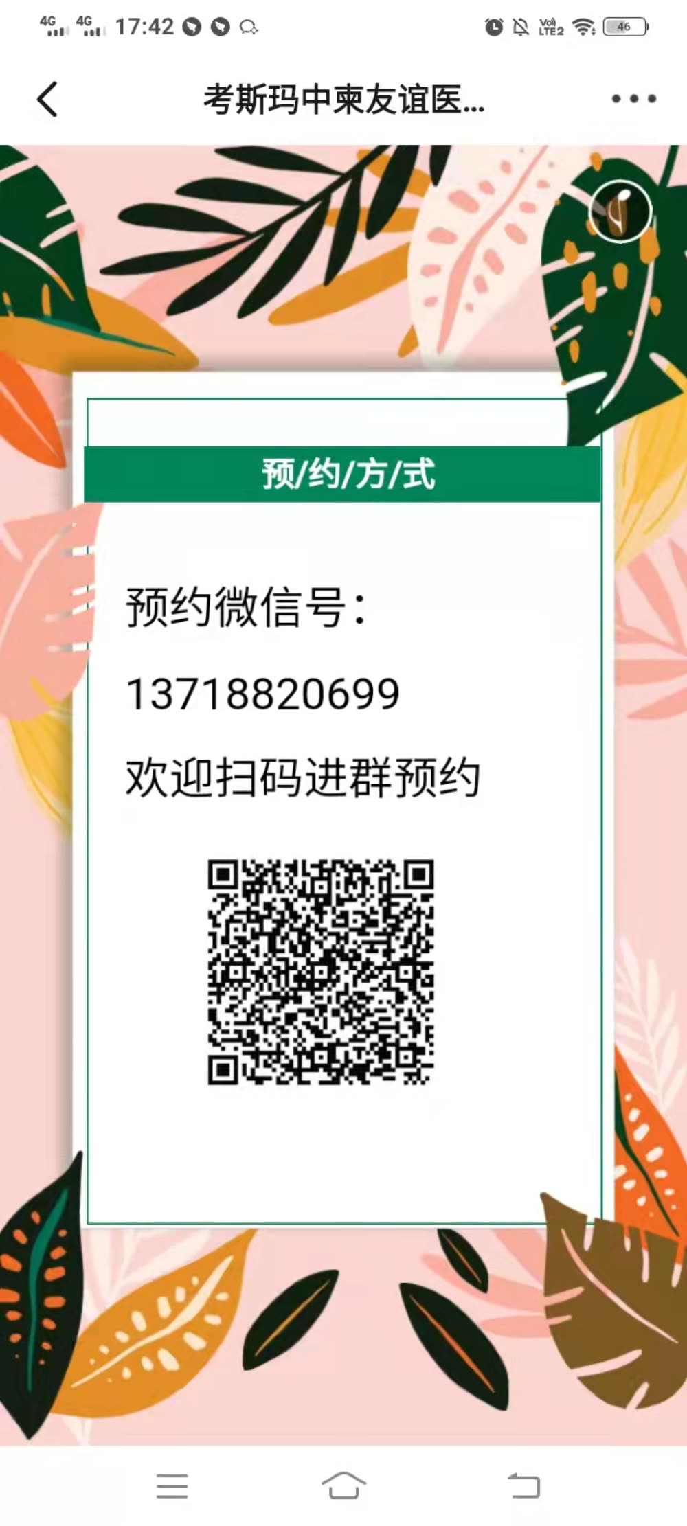 中医科门诊(试运行期)实行周一到周六上午半天门诊,须至少提前2天在微信端预约。因特殊情况不能按时就诊,请提前24h在微信端取消预约。预约微信群二维码如下: