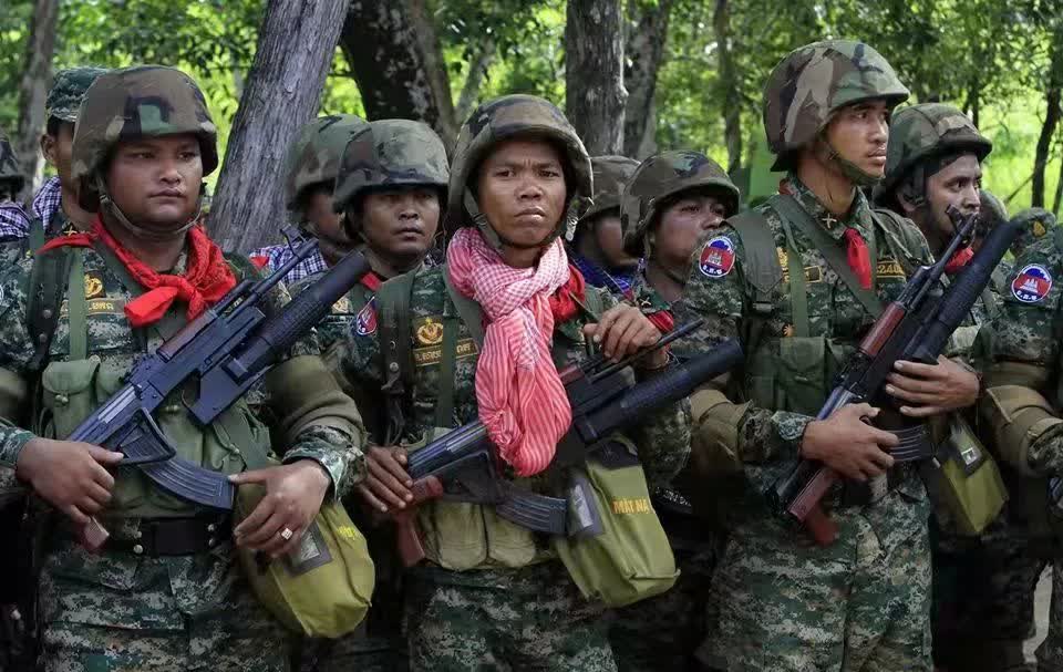 在柬埔寨,许多当地民众身上随身带着一块格子布,就是军人也不例外,有的盘在头顶,有的围在脖项,有的系在腰间,有的包裹头部和脸部。