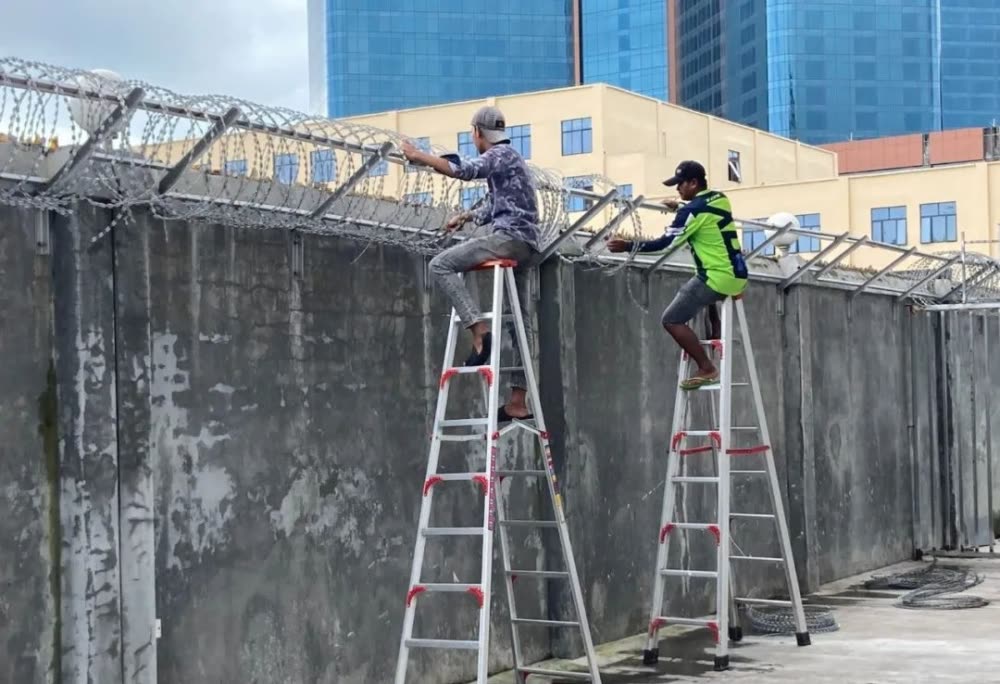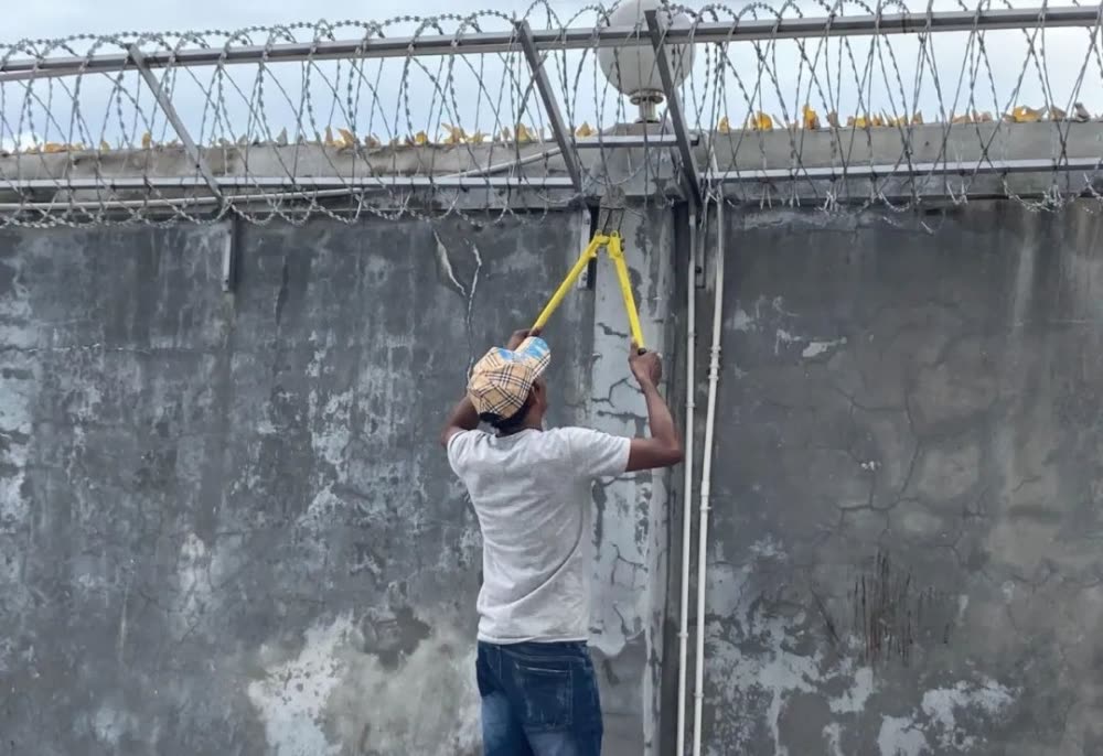 工人剪掉围墙上的铁丝网