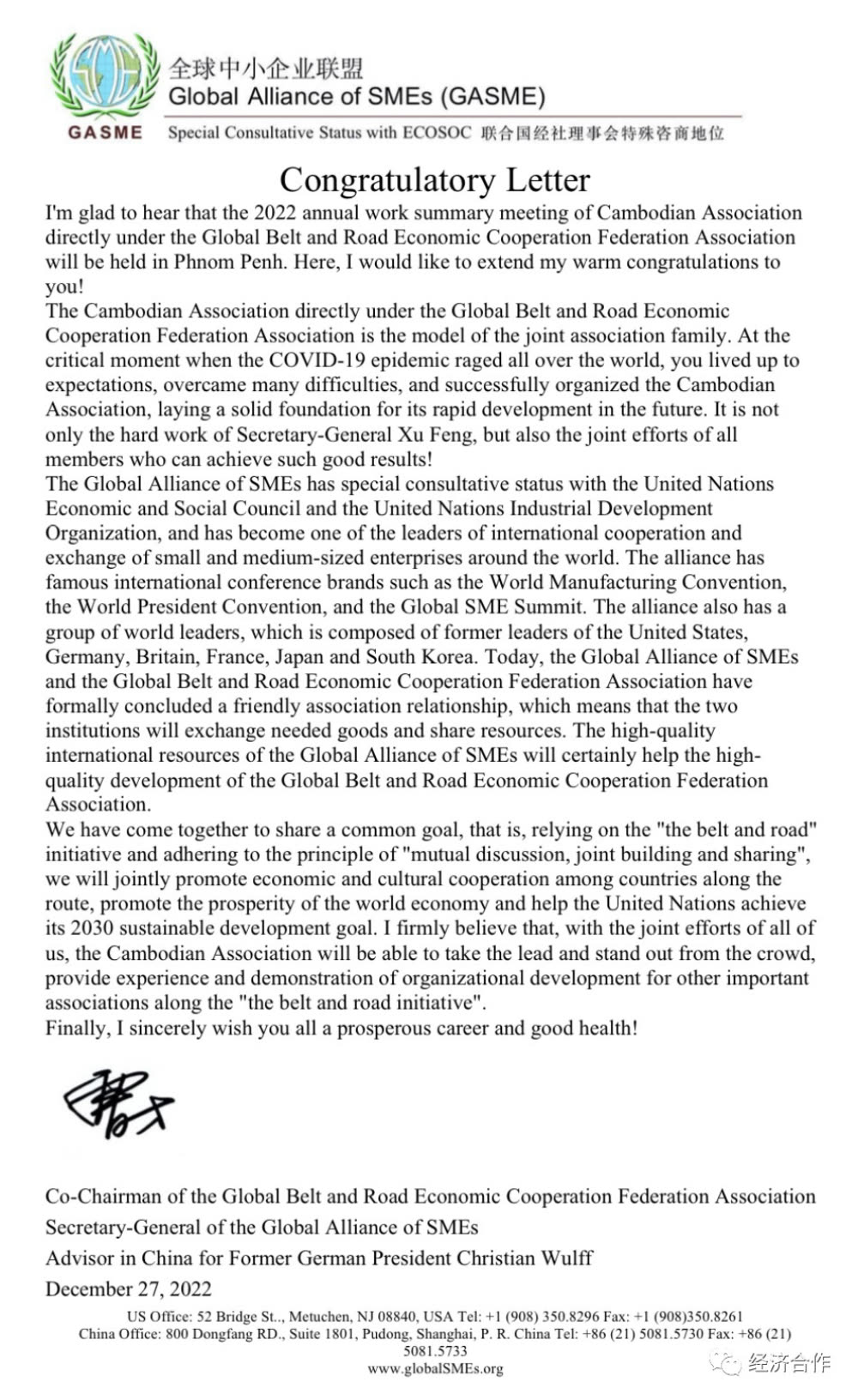 Secretary-General Cao Fang of the Global Alliance of SMEs, a United Nations consulting agency, sent a congratulatory letter on behalf of the Alliance for the 2022 annual meeting of the "Belt and Road" Economic Cooperation (Cambodia) Association, and jointly signed a long-term "Friendship Association" strategic cooperation agreement.