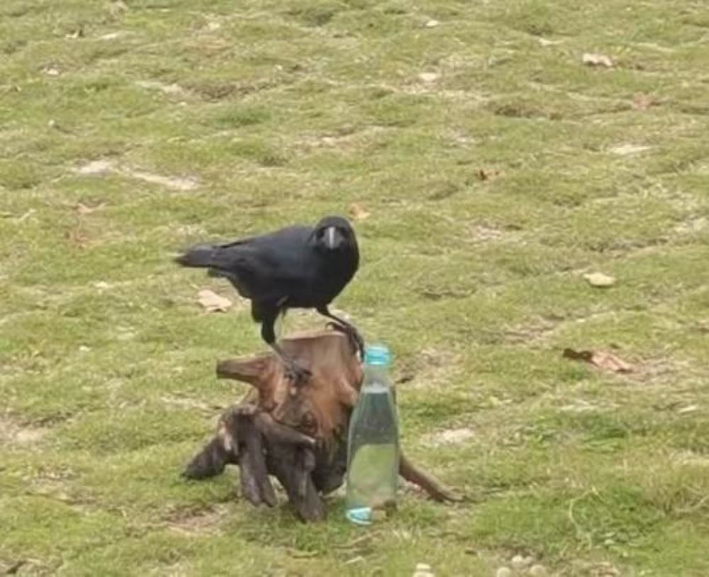 2月25日,广东惠州,一名游客在社交平台上分享的一段生态园里乌鸦喝水的视频,引发热议。视频显示,起初瓶子里的水不多,瓶口很小,乌鸦的嘴够不着水。几次尝试后,乌鸦便从旁边叼起石子投到水瓶里,随着乌鸦一次次地投石子,水瓶里的水也逐渐上升。