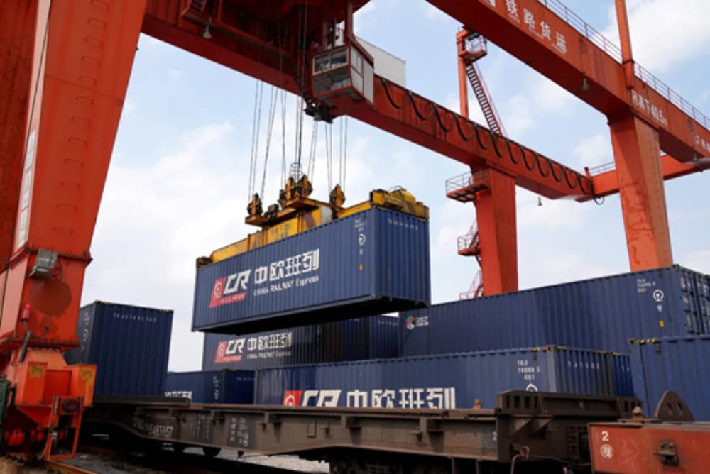 满载着柳工等企业物资的集装箱正转运至中欧班列上(柳工供图)