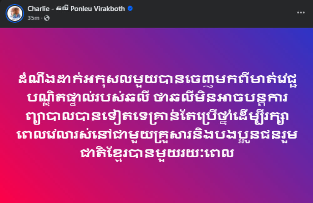 នេះបើយោងតាមការបង្ហោះសំណេរក្នុងផេកផ្លូវការ Charlie - ឆលី Ponleu Virakboth បានរៀបរាប់ទាំងក្ដុកក្ដួលថា៖ «ដំណឹងអកុសលមួយបានចេញមកពីមាត់វេជ្ជបណ្ឌិតផ្ទាល់របស់ឆលី ថាឆលីមិនអាចបន្តការព្យាបាលបានទៀតទេគ្រាន់តែប្រើថ្នាំដើម្បីរក្សាពេលវេលារស់នៅជាមួយគ្រួសារនិងបងប្អូនជនរួមជាតិខ្មែរបានមួយរយៈពេល»។