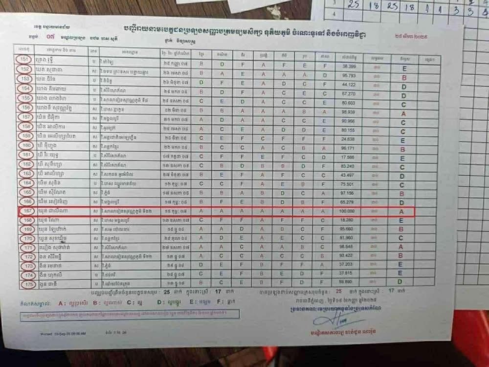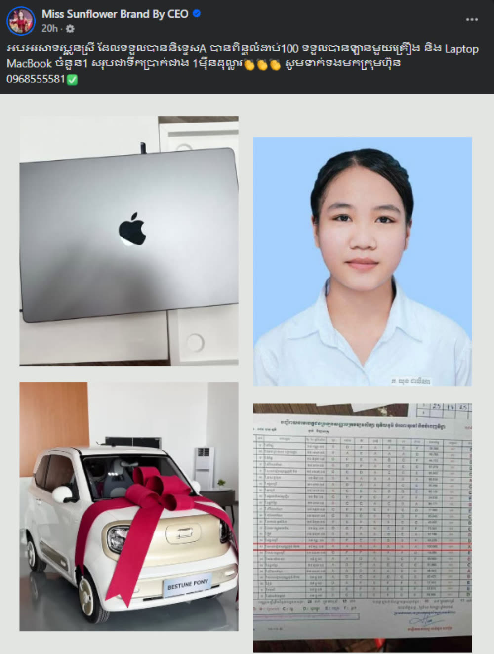 នេះបើយោងតាមការបង្ហោះរបស់ ចែយៀក បានប្រកាសបែបនេះថា៖ «អបអរសាទរប្អូនស្រី ដែលទទួលបាននិទ្ទេសA បានពិន្ទុលំដាប់១០០ ទទួលបានឡាន ១គ្រឿង និង Laptop MacBook ចំនួន១ សរុបជាទឹកប្រាក់ជាង ១មុឺនដុល្លារ»។