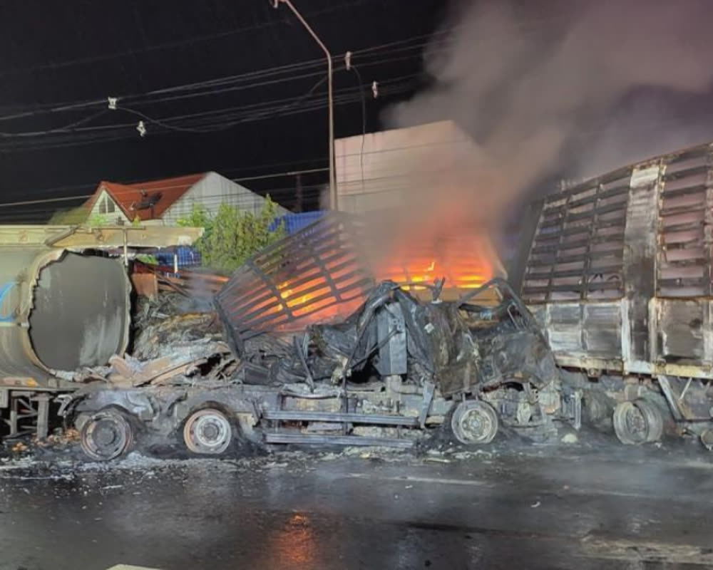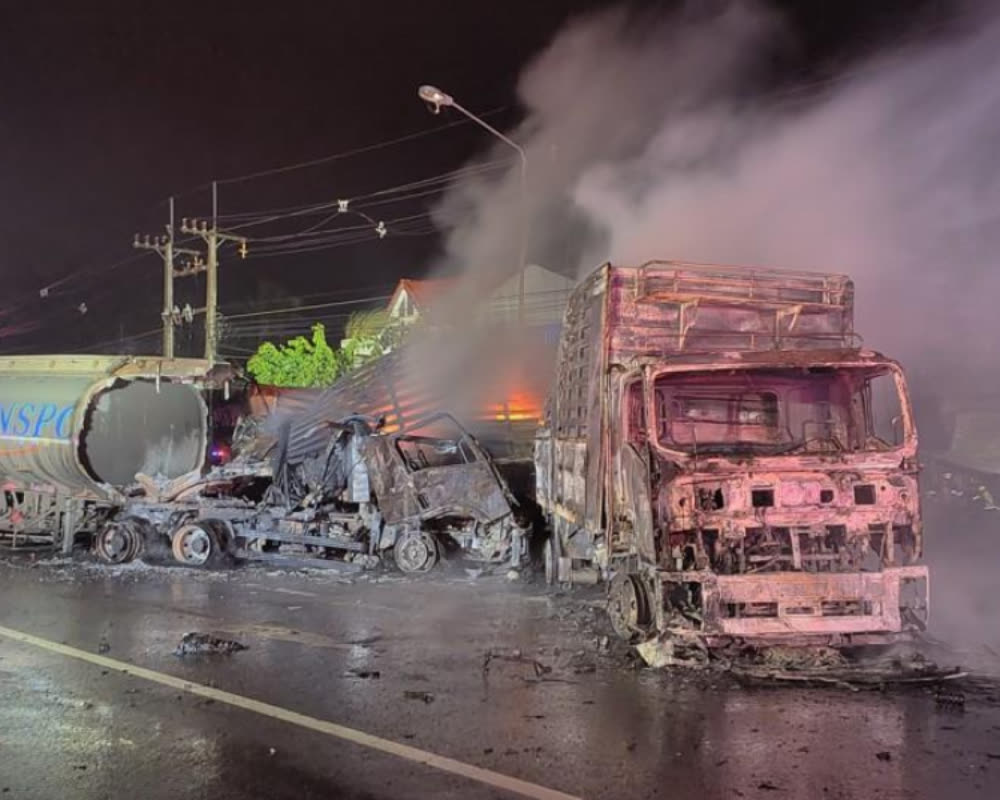 10月29日当地时间00:30,泰国呵叻乔猜-乌敦路24号公路路段开往武里喃府娘隆县方向,武里喃农吉县中央十字路口,一辆运油车与一辆18轮卡车相撞,随后运油车发生爆炸引发大火将两车烧毁。此外,运油车爆炸后汽油泄漏到地面与下水道内,火势沿着汽油蔓延至附近房屋、商铺以及路边车辆,导致附近不少于10间商铺、20多辆汽车烧毁严重。事故发生时巨大的爆炸声引起附近居民的恐慌,随后附近居民迅速逃离至安全区域。