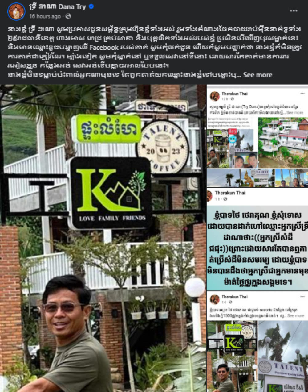 នេះបើយោងតាមការបង្ហោះរបស់ អ្នកស្រី ទ្រី ដាណា បានប្រកាសយ៉ាងដូច្នេះថា៖ « នាងខ្ញុំ ទ្រី ដាណា បានប្រកាសយ៉ាងដូច្នេះថា៖« សូមប្រកាសជូនសម្ព័ន្ធក្រុមហ៊ុនខ្ញុំទាំងអស់ រួមទាំងតំណាងចែកចាយរាប់ម៉ឺននាក់ទូទាំង ២៥រាជធានីខេត្ត ហាងមាស ពេជ្រ គ្រប់សាខា និងបុគ្គលិកទាំងអស់របស់ខ្ញុំ ប្រសិនបើឃើញបុរសម្នាក់នេះ និងមានឈ្មោះដូចបង្ហាញលើ Facebook របស់គាត់ សូមកុំលក់ជូន ហើយក៏សូមបញ្ជាក់ថា នាងខ្ញុំក៏មិនត្រូវការគាត់ជាភ្ញៀវដែរ។ ម្យ៉ាងទៀត សូមកុំស្នាក់នៅ ឬទទួលសេវានៅទីនោះ ដោយសារតែគាត់មានការរាររអៀសខ្លួន កន្លែងអន់ សេវាអន់ទើបខ្លាចរអាលបែបនេះ។