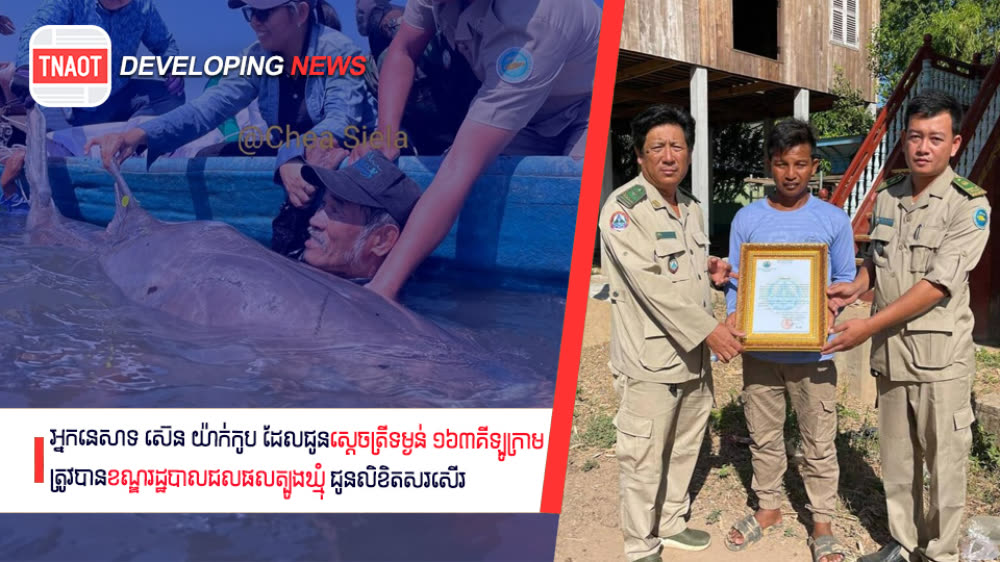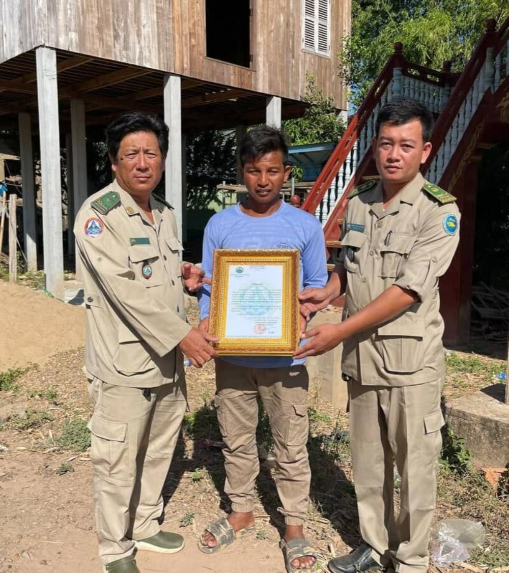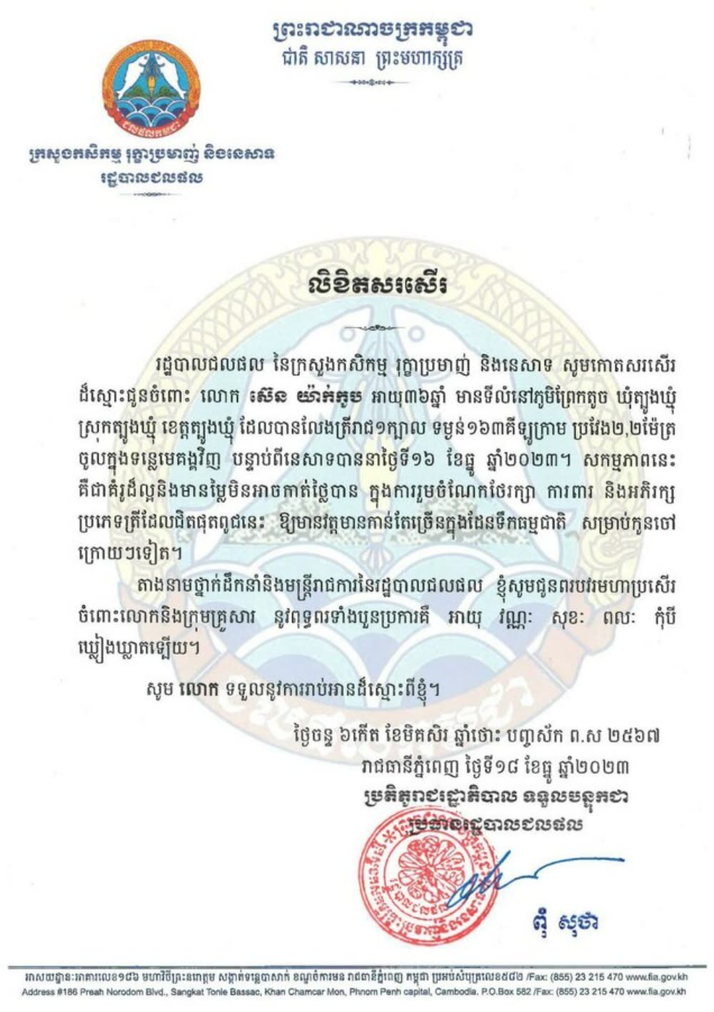 អ្នកនេសាទឈ្មោះ ស៊េន យ៉ាក់កូប ទទួលបានលិខិតសរសើរ បន្ទាប់ពីប្រគល់ត្រីរាជញី១ក្បាលឈ្មោះ «នារីរ័ត្នត្បូងឃ្មុំ» ជូនរដ្ឋបាលជលផល