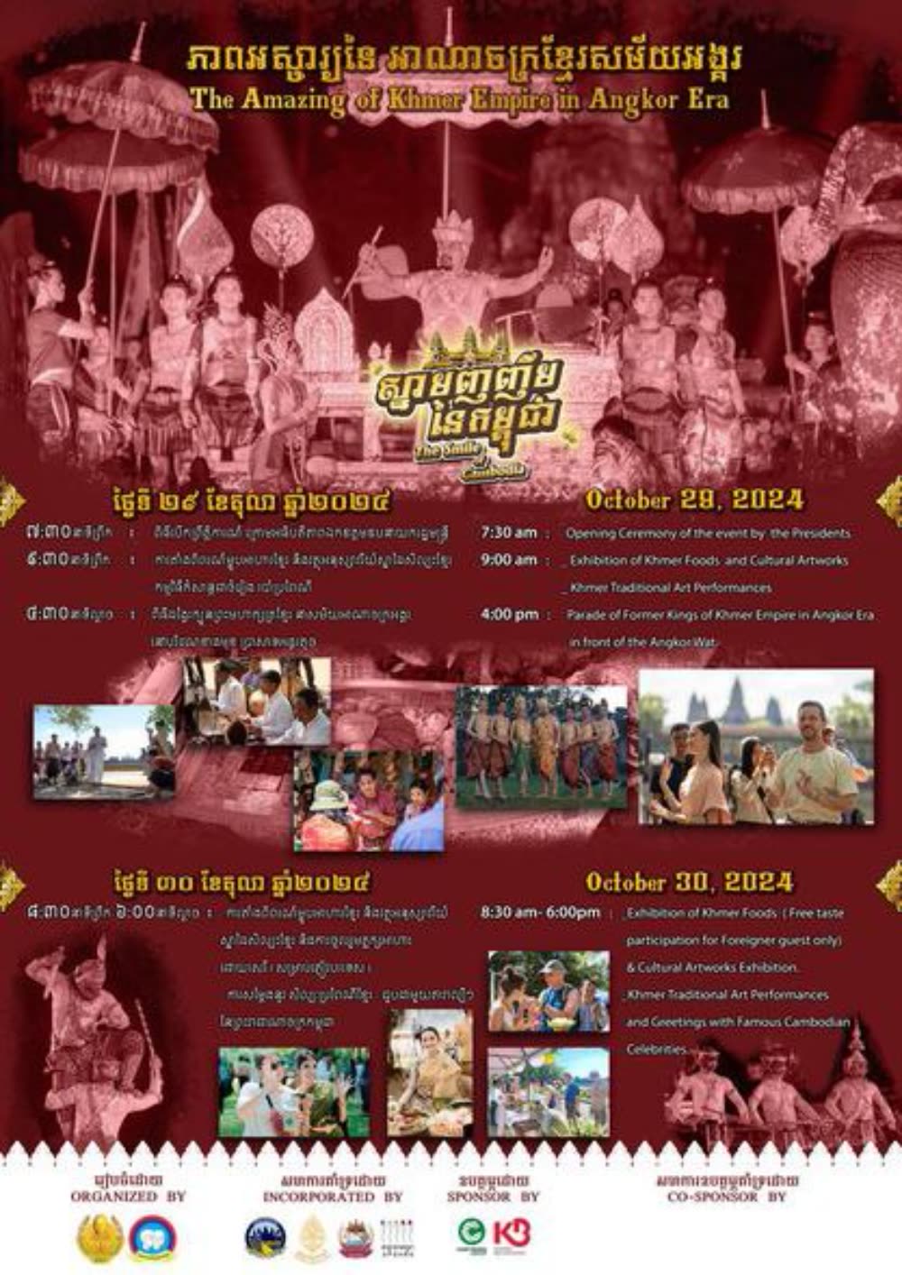 តាមរយៈការផ្តល់ព័ត៌មានពីរដ្ឋបាលខេត្តសៀមរាប បានឲ្យដឹងយ៉ាងដូច្នេះថា ក្រសួងវប្បធម៌ និងវិចិត្រសិល្បៈនឹងរៀបចំព្រឹត្តិការណ៍នេះដោយរៀបចំកម្មវិធីជាច្រើននៃអាណាចក្រខ្មែរ នាសម័យអង្គររួមមាន៖ ១. ក្បួនដង្ហែព្រះមហាក្សត្រនាសម័យអាណាចក្រខ្មែរ។ ២. ការសម្តែងនូវរបាំបុរាណនៅមុខប្រាង្គប្រាសាទអង្គរវត្តដ៏អស្ចារ្យ។៣. ពិព័រណ៍ម្ហូបអាហារ និងវត្ថុស្នាដៃសិល្បៈវប្បធម៌ និងការចូលរួមភ្លក្សអាហារដោយសេរី (សម្រាប់ភ្ញៀវបរទេស)។ ៤. ការសម្តែងនូវសិល្បៈប្រពៃណីខ្មែរ ជួបជាមួយតារាល្បីៗ នៃព្រះរាជាណាចក្រកម្ពុជា។ ៥. ការប្រកួត «ទីងម៉ោង» ទៀតផង។