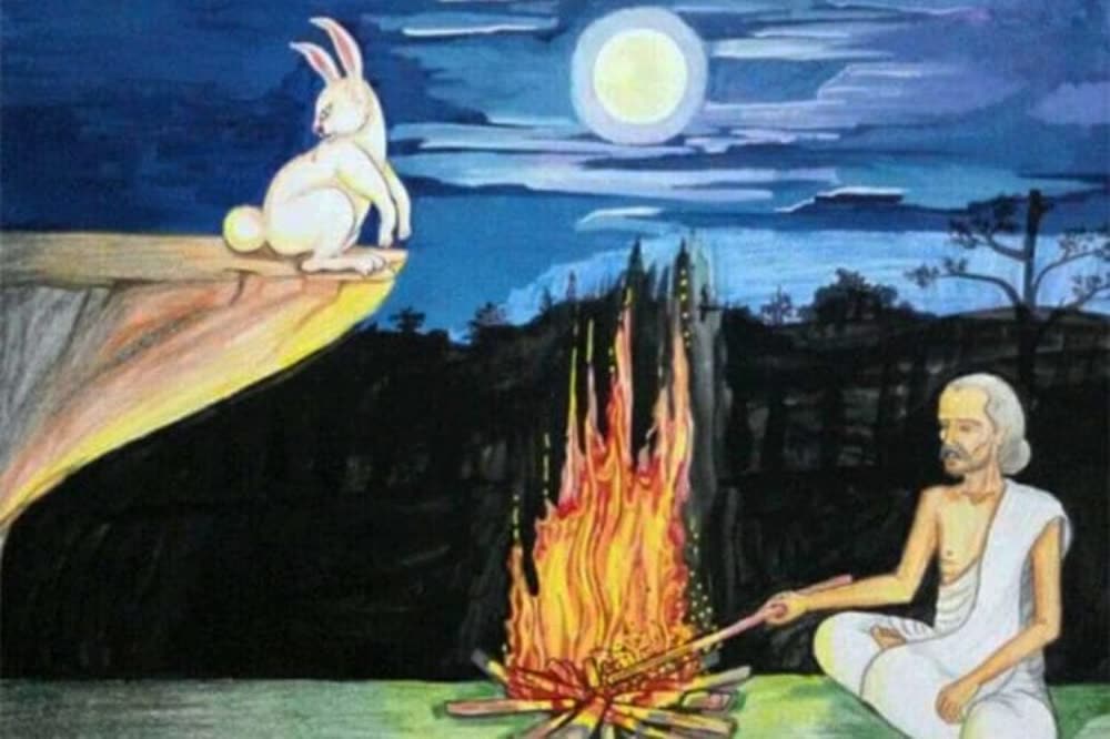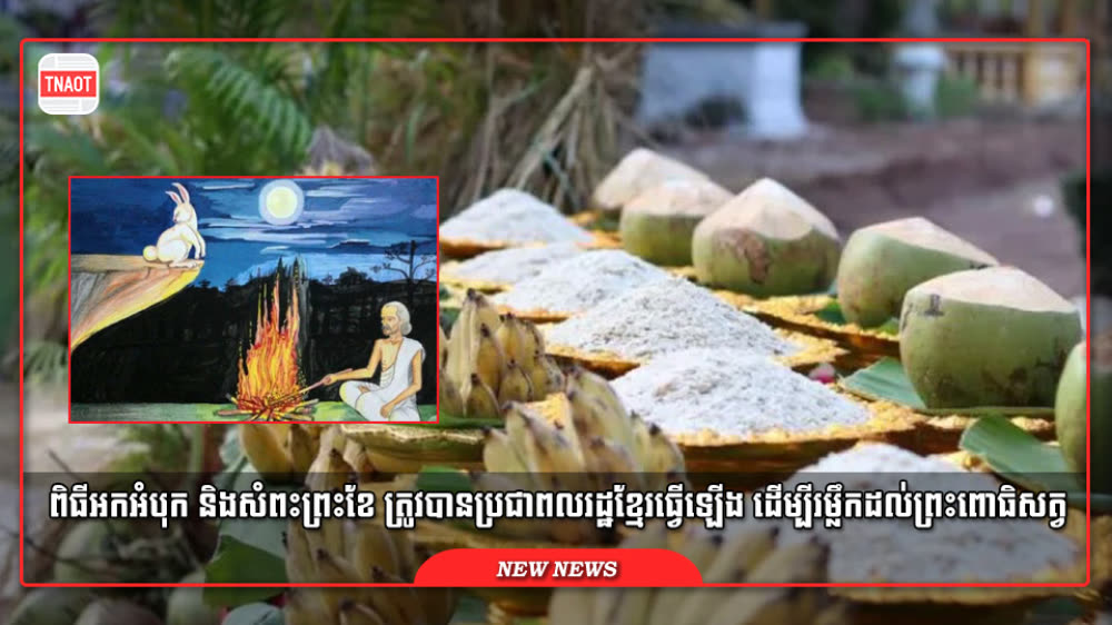 ទ្រឹស្តីពុទ្ធចក្រ បានឲ្យដឹងថា ការគិតរបស់ព្រះពោធិសត្វនេះ បានក្ដៅដល់ឥន្ទ្រព្រាហ្មណ៍ ហើយព្រះអង្គបាននិយាយថា «ជីវិតខ្ញុំនឹងក្ស័យជាមិនខានធ្វើម្ដេចនឹងបានអាហារបរិភោគ»។ ពេលនោះទន្សាយពោធិសត្វបានពោលថា «ខ្ញុំមានតែសាច់ និងឈាមត្រូវការឲ្យជាទាន បើអ្នកចង់បានចូររកអុសមកបង្កាត់ភ្លើងទៅចុះ ខ្ញុំនឹងលោតចូលក្នុងភ្លើងឲ្យបានជាអាហារបរិភោគ»។ ឥន្ទ្រព្រាហ្មណ៍គ្រាន់តែឮដូច្នេះ ក៏ទៅបង្កាត់ភ្លើងចំណែកឯទន្សាយ ក៏លោតចូលភ្លើងភ្លាមប៉ុន្តែ ដោយអំណាចនៃសេចក្ដីជ្រះថ្លា ព្រះឥន្ទ្រក៏ហោះទៅទ្រមិនឲ្យភ្លើងឆេះរោមមួយសរសៃឡើយ។ ឃើញដូច្នេះ ព្រះឥន្ទ្រក៏ហោះទៅឋានលើ យកថ្មកែវមនោសិលាគូសរូបទន្សាយនៅក្នុងរង្វង់ព្រះចន្ទ ជាប់តាំងពីនោះរហូតមក ហើយមនុស្សគ្រប់រូបឃើញរូបទន្សាយច្បាស់នៅថ្ងៃ១៥កើត។ គួរឱ្យដឹងដែរថា រណ្តាប់សែន ក្នុងពិធីបុណ្យអកអំបុក និងសំពះព្រះខែ រួមមាន អំបុក ចេក ដូង ដំឡូង ត្រាវ អំពៅ និងផ្លែឈើផ្សេងៗ និងទៀន ធូប ភ្ញីផ្កាជាដើម។