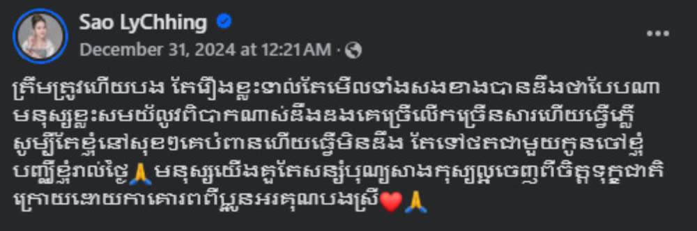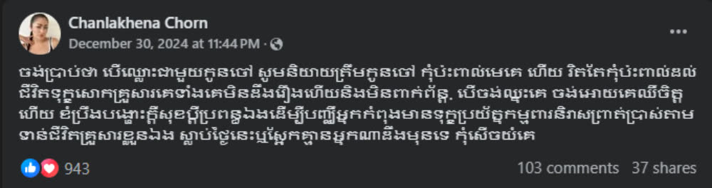 បន្ទាប់ពីឃើញសារមួយនេះហើយម្ចាស់ប្រេនចែឈីង ក៏បានស៊ែរឆ្លើយតបថា៖ «ត្រឹមត្រូវហើយបង តែរឿងខ្លះទាល់តែមើលទាំងសងខាងបានដឹងថាបែបណា មនុស្សខ្លះសម័យឥលូវពិបាកណាស់ឌឺដងគេច្រើនលើកច្រើនសារហើយធ្វើភ្លើ សូម្បីតែខ្ញុំនៅសុខៗគេបំពានហើយធ្វើមិនដឹង តែទៅថតជាមួយកូនចៅខ្ញុំបញ្ឈឺខ្ញុំរាល់ថ្ងៃមនុស្សយើងគួរតែសន្សំបុណ្យសាងកុសលល្អចេញពីចិត្តទុក្ខជាតិក្រោយដោយកាគោរពពីប្អូនអរគុណបងស្រី»៕
